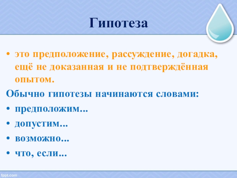 Гипотеза это предположение, рассуждение, догадка, ещё не доказанная и не подтверждённая опытом. Обычно гипотезы начинаются словами:предположим... допустим...
