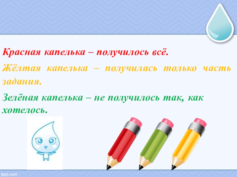 Красная капелька – получилось всё.Жёлтая капелька – получилась только часть задания.Зелёная капелька – не получилось так, как
