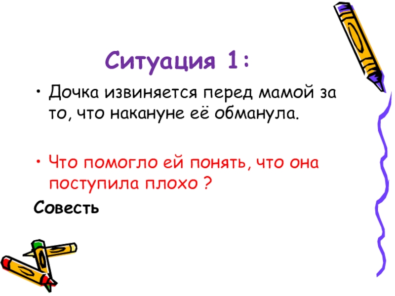 Ситуация 1:Дочка извиняется перед мамой за то, что накануне её обманула.Что помогло ей понять, что она поступила