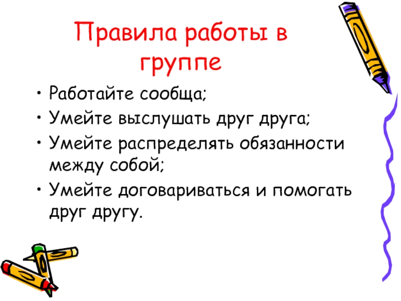 Правила работы в группеРаботайте сообща;Умейте выслушать друг друга;Умейте распределять обязанности между собой;Умейте договариваться и помогать друг другу.