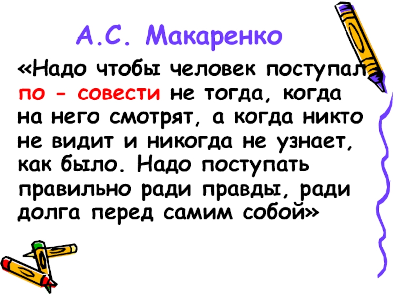 А.С. Макаренко«Надо чтобы человек поступал  по - совести не тогда, когда на него смотрят, а когда