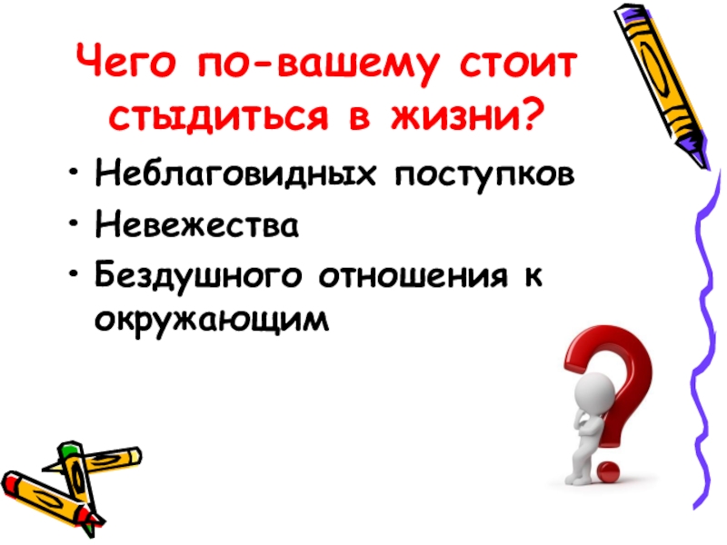 Слайд 7Чего по-вашему стоит стыдиться в жизни?