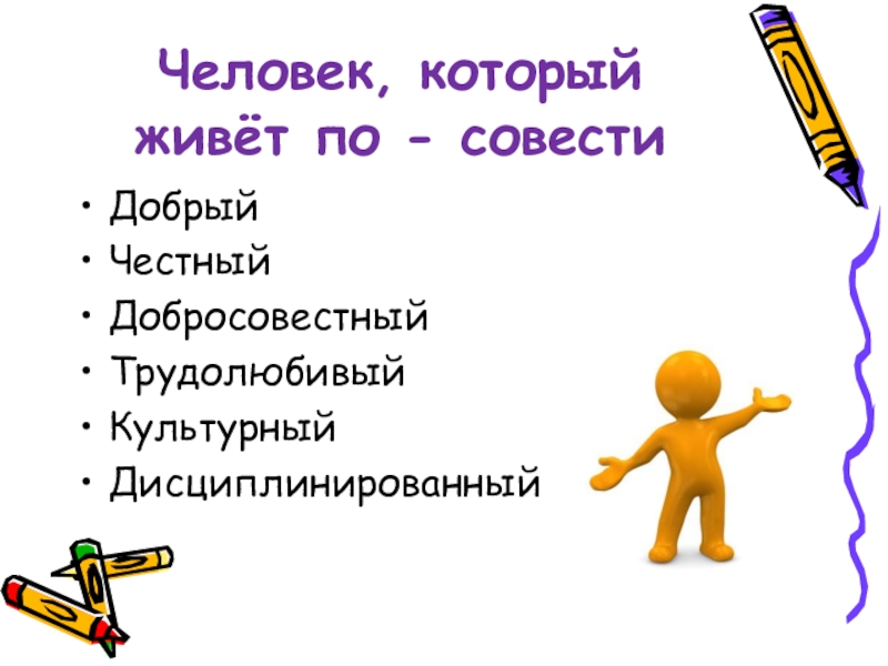Человек, который живёт по - совестиДобрыйЧестныйДобросовестныйТрудолюбивыйКультурныйДисциплинированный