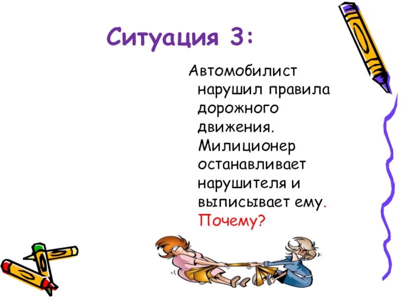 Ситуация 3:Автомобилист нарушил правила дорожного движения. Милиционер останавливает нарушителя и выписывает ему.Почему?