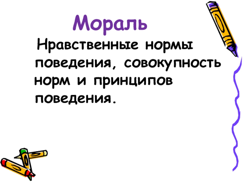 Мораль  Нравственные нормы поведения, совокупность норм и принципов поведения.