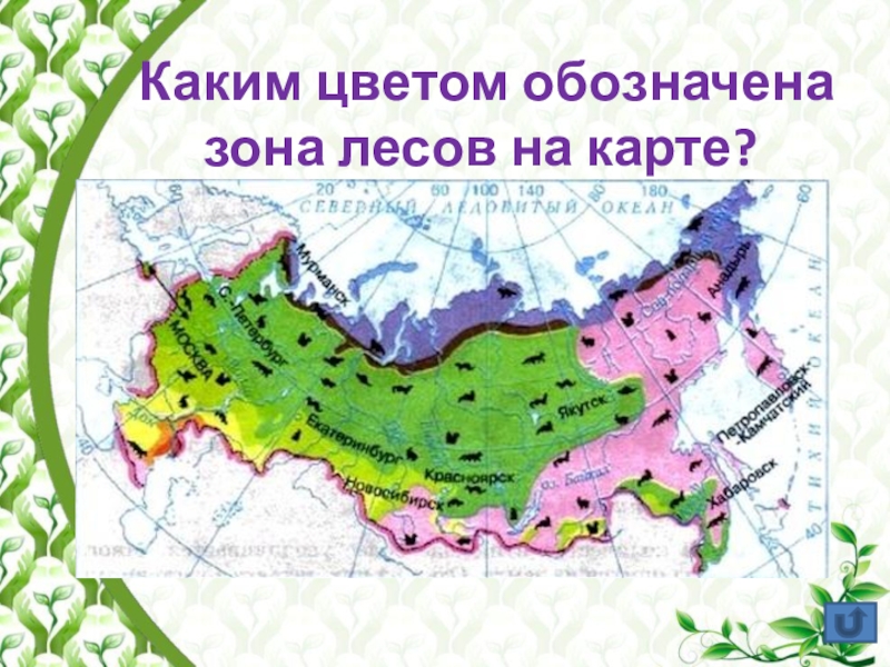 Слайд 4Каким цветом обозначена зона лесов на карте?