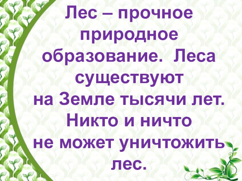 Лес – прочное природноеобразование. Леса существуют на Земле тысячи лет. Никто и ничто не может уничтожить лес.