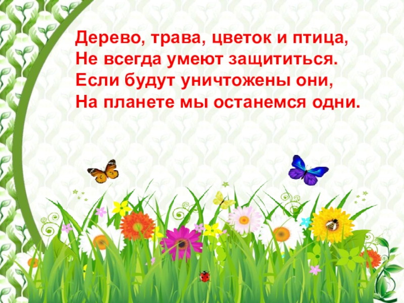Дерево, трава, цветок и птица, Не всегда умеют защититься. Если будут уничтожены они, На планете мы останемся