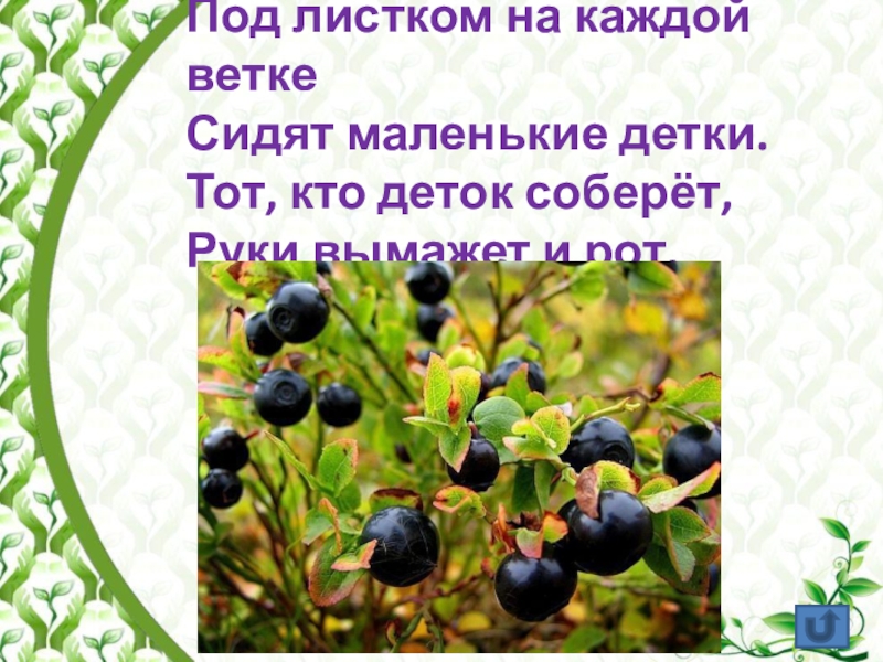 Слайд 14Под листком на каждой ветке Сидят маленькие детки. Тот, кто деток соберёт, Руки вымажет