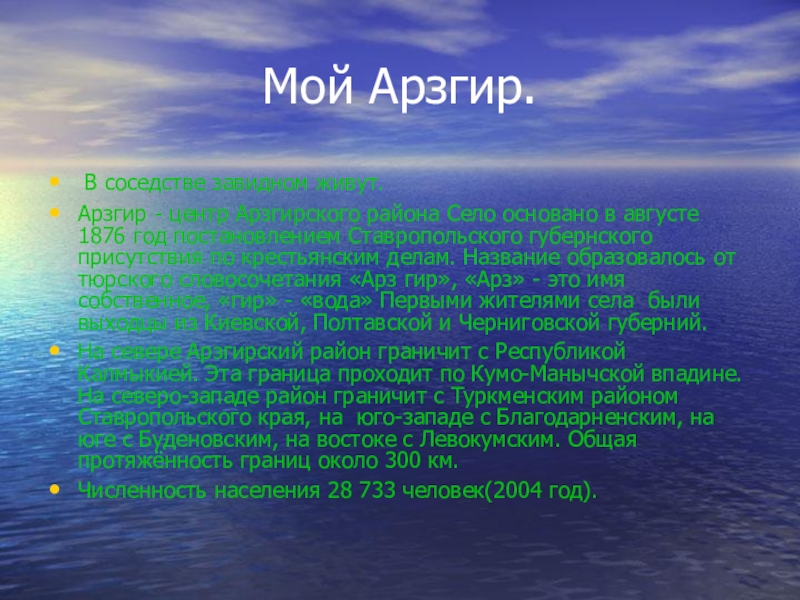 основано в августе 1876 год постановлением Ставропольского губернского присутствия по крестьянским делам. Название образовалось от тюрского словосочетания «Арз гир», «Арз» - это имя собственное, «гир» - «вода» Первыми жителями села были выходцы из Киевской, Полтавской и Черниговской губерний.