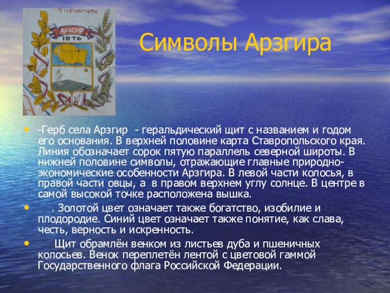 геральдический щит с названием и годом его основания. В верхней половине карта Ставропольского края. Линия обозначает сорок пятую параллель северной широты. В нижней половине символы, отражающие главные природно-экономические особенности Арзгира. В левой части колосья, в правой части овцы, а в правом верхнем углу солнце. В центре в самой высокой точке расположена вышка.