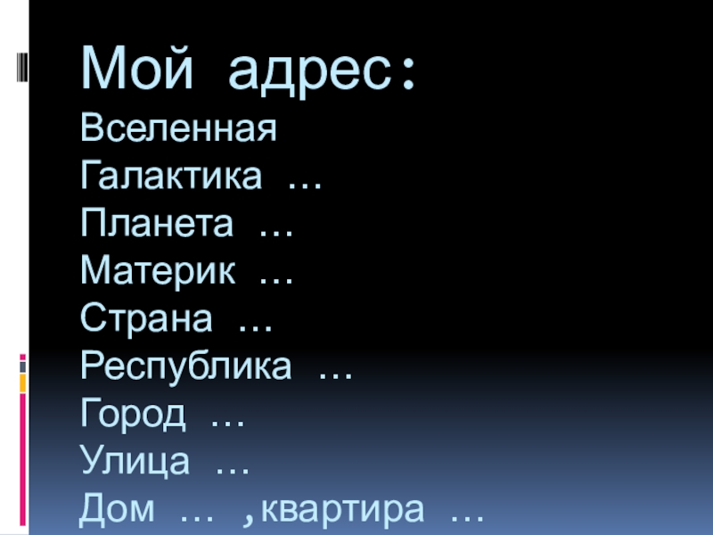 Мой адрес: Вселенная Галактика … Планета … Материк … Страна … Республика … Город … Улица …