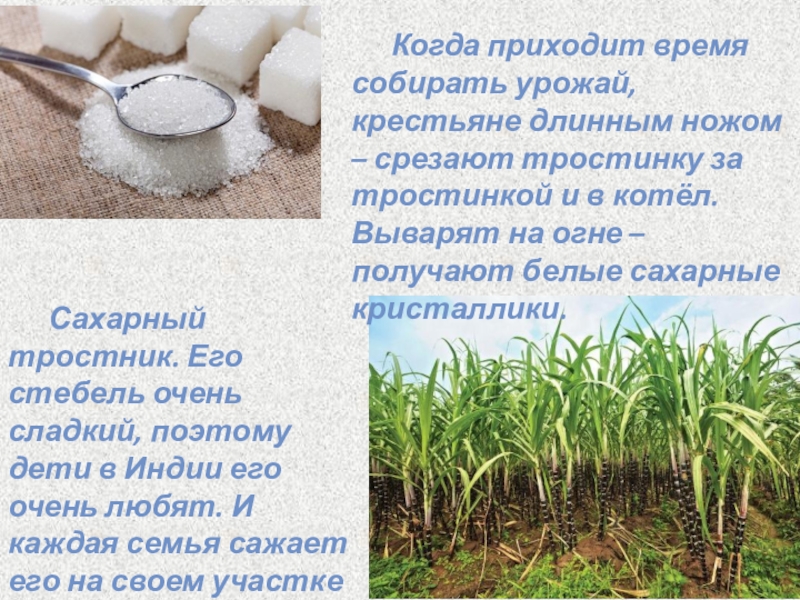 Когда приходит время собирать урожай, крестьяне длинным ножом – срезают тростинку за тростинкой и в котёл. Выварят на огне – получают белые сахарные кристаллики.