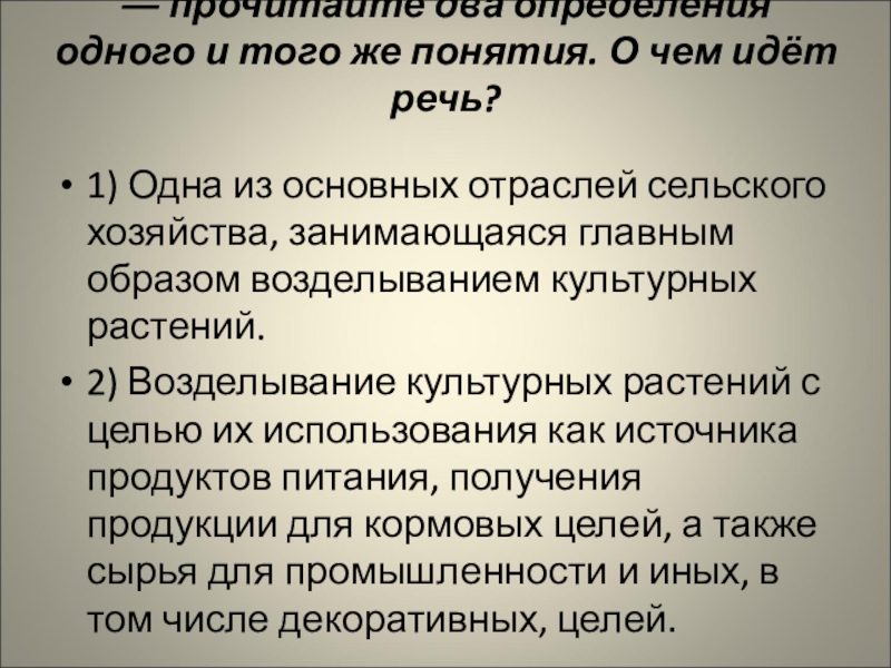 1) Одна из основных отраслей сельского хозяйства, занимающаяся главным образом возделыванием культурных растений.