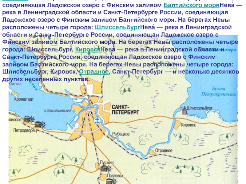 и Санкт-ПетербургеНева́ — река в Ленинградской области и Санкт-Петербурге РоссииНева́ — река в Ленинградской области и Санкт-Петербурге России, соединяющая Ладожское озероНева́ — река в Ленинградской области и Санкт-Петербурге России, соединяющая Ладожское озеро с Финским заливомНева́ — река в Ленинградской области и Санкт-Петербурге России, соединяющая Ладожское озеро с Финским заливом Балтийского моряНева́ — река в Ленинградской области и Санкт-Петербурге России, соединяющая Ладожское озеро с Финским заливом Балтийского моря. На берегах Невы расположены четыре города: ШлиссельбургНева́ — река в Ленинградской области и Санкт-Петербурге России, соединяющая Ладожское озеро с Финским заливом Балтийского моря. На берегах Невы расположены четыре города: Шлиссельбург, КировскНева́ — река в Ленинградской области и Санкт-Петербурге России, соединяющая Ладожское озеро с Финским заливом Балтийского моря. На берегах Невы расположены четыре города: Шлиссельбург, Кировск, Отрадное, Санкт-Петербург — и несколько десятков других населенных пунктов.