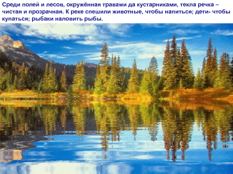 Слайд 25Среди полей и лесов, окружённая травами да кустарниками, текла речка –
