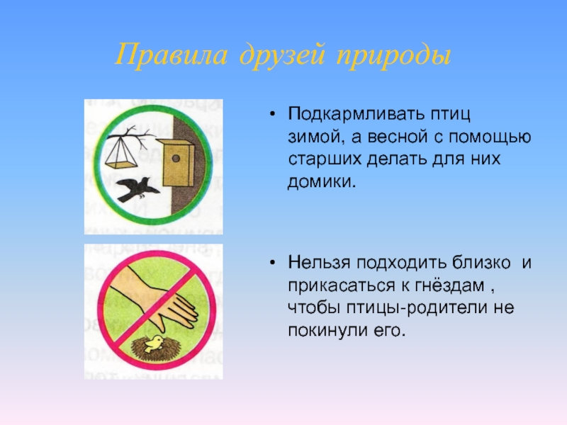 Нельзя подходить близко и прикасаться к гнёздам , чтобы птицы-родители не покинули его.