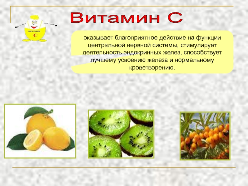 Витамин С оказывает благоприятное действие на функции центральной нервной системы, стимулирует деятельность эндокринных желез, способствует лучшему усвоению