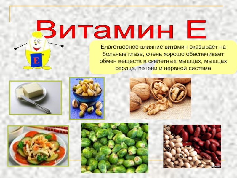 Витамин Е ЕБлаготворное влияние витамин оказывает на больные глаза, очень хорошо обеспечивает обмен веществ в скелетных мышцах,
