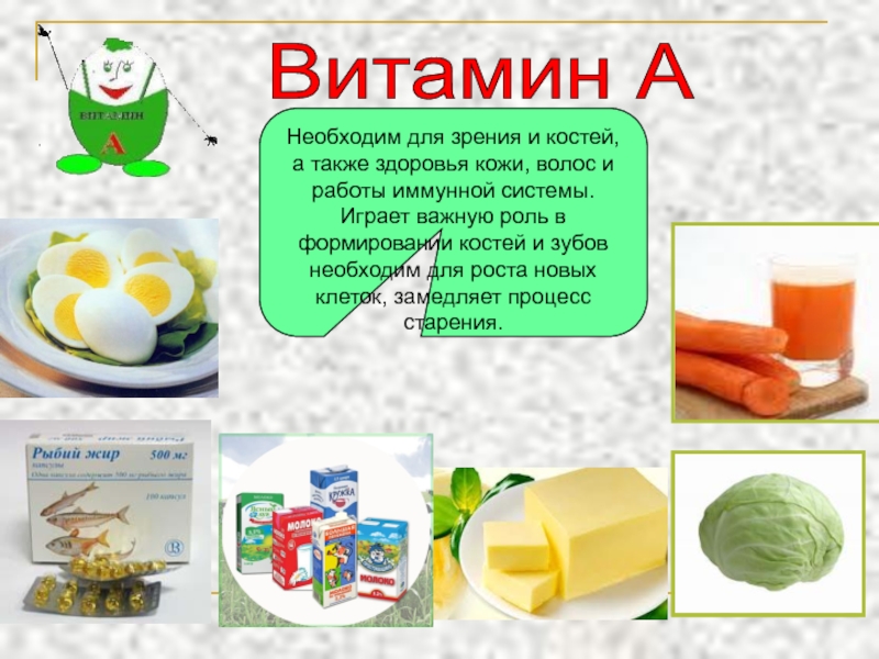 Витамин А Необходим для зрения и костей, а также здоровья кожи, волос и работы иммунной системы. Играет