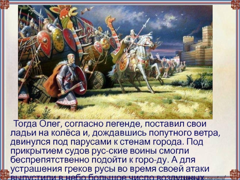 Слайд 7 Тогда Олег, согласно легенде, поставил свои ладьи на колёса и, дождавшись