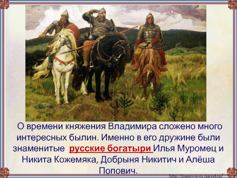 Слайд 11 О времени княжения Владимира сложено много интересных былин. Именно в его