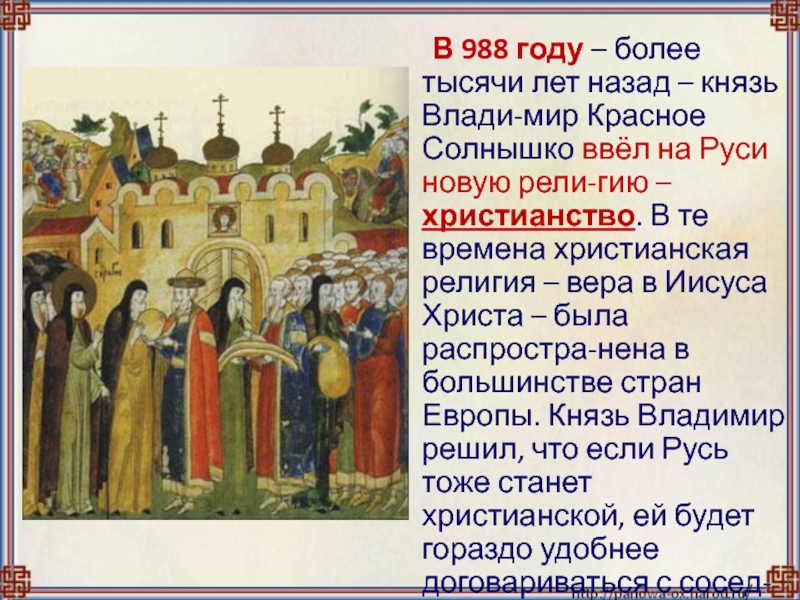 Красное Солнышко ввёл на Руси новую рели-гию – христианство. В те времена христианская религия – вера в Иисуса Христа – была распростра-нена в большинстве стран Европы. Князь Владимир решил, что если Русь тоже станет христианской, ей будет гораздо удобнее договариваться с сосед-ними странами.