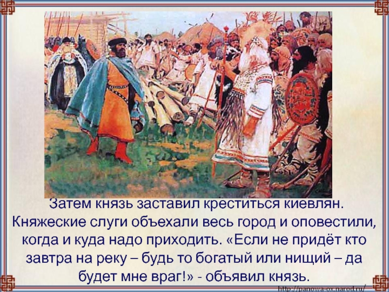 Слайд 14 Затем князь заставил креститься киевлян. Княжеские слуги объехали весь город и