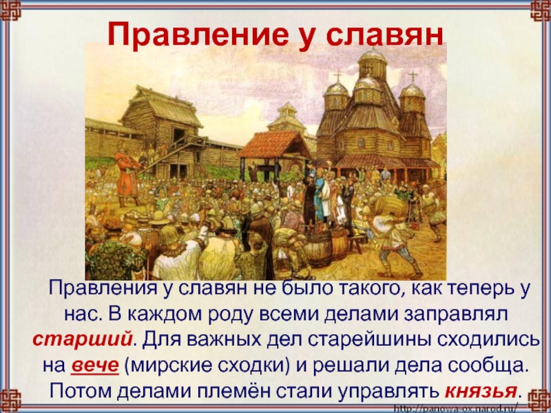 нас. В каждом роду всеми делами заправлял старший. Для важных дел старейшины сходились на вече (мирские сходки) и решали дела сообща. Потом делами племён стали управлять князья.