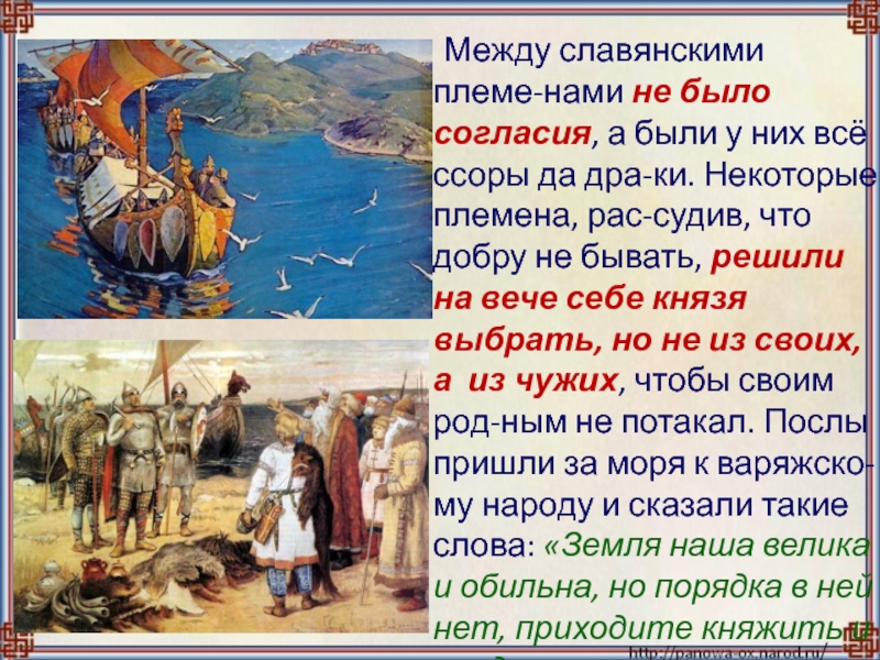 ссоры да дра-ки. Некоторые племена, рас-судив, что добру не бывать, решили на вече себе князя выбрать, но не из своих, а из чужих, чтобы своим род-ным не потакал. Послы пришли за моря к варяжско- му народу и сказали такие слова: «Земля наша велика и обильна, но порядка в ней нет, приходите княжить и владеть нами».