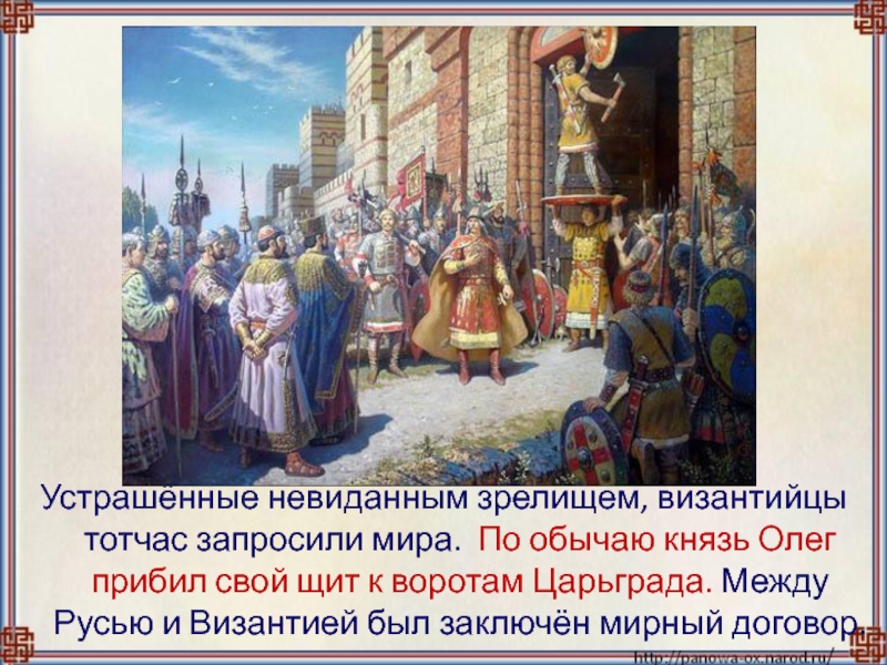 Слайд 8Устрашённые невиданным зрелищем, византийцы тотчас запросили мира. По обычаю князь Олег