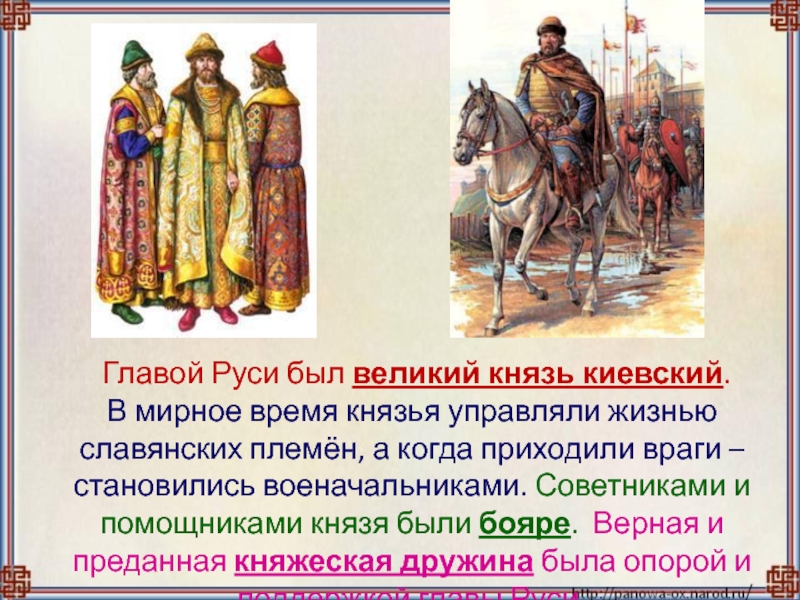 В мирное время князья управляли жизнью славянских племён, а когда приходили враги – становились военачальниками. Советниками и помощниками князя были бояре. Верная и преданная княжеская дружина была опорой и поддержкой главы Руси.