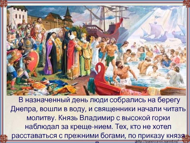 и священники начали читать молитву. Князь Владимир с высокой горки наблюдал за креще-нием. Тех, кто не хотел расставаться с прежними богами, по приказу князя загоняли в Днепр силой.