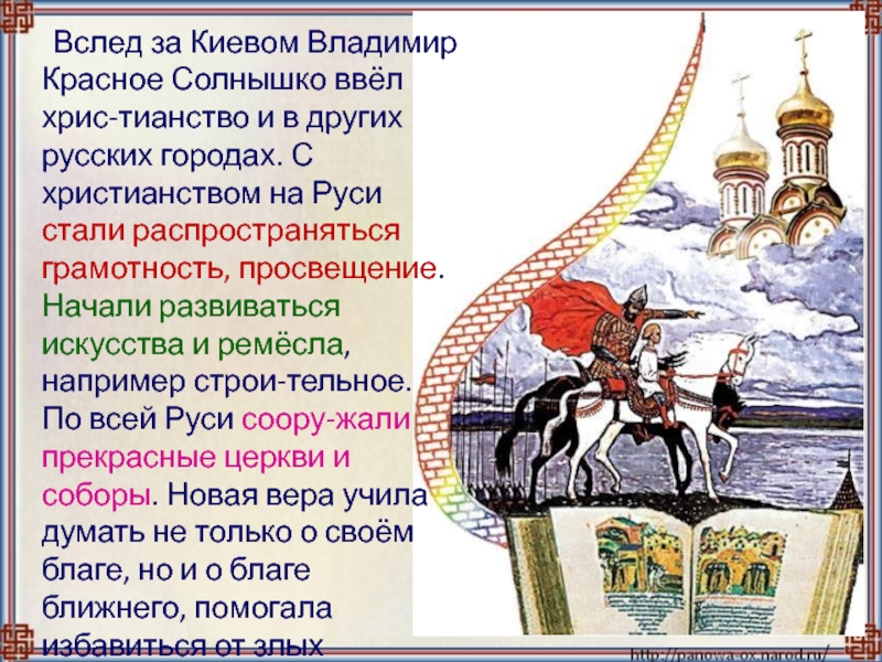 русских городах. С христианством на Руси стали распространяться грамотность, просвещение. Начали развиваться искусства и ремёсла, например строи-тельное. По всей Руси соору-жали прекрасные церкви и соборы. Новая вера учила думать не только о своём благе, но и о благе ближнего, помогала избавиться от злых помыслов, сплачивала и объединяла людей.