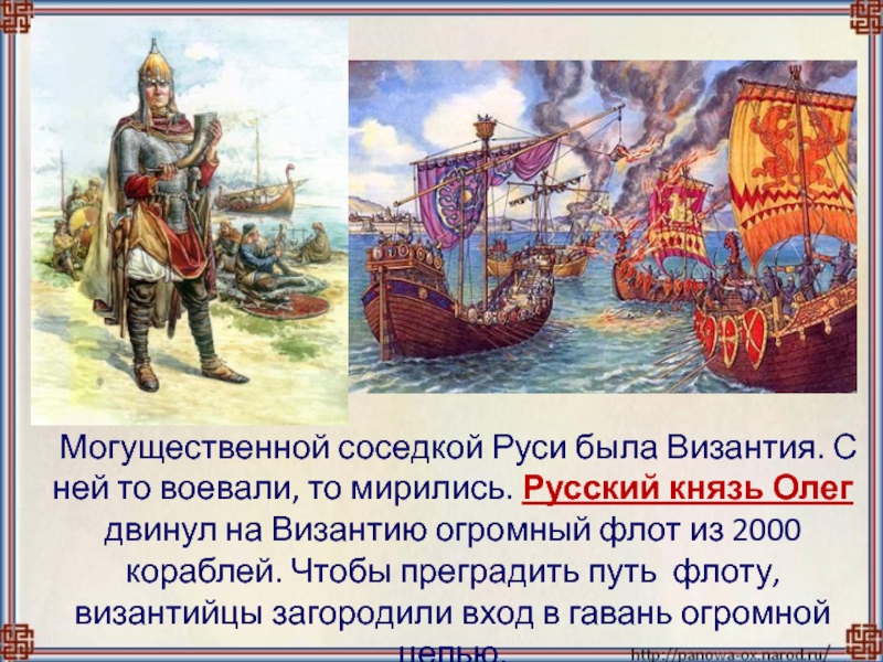 Русский князь Олег двинул на Византию огромный флот из 2000 кораблей. Чтобы преградить путь флоту, византийцы загородили вход в гавань огромной цепью.