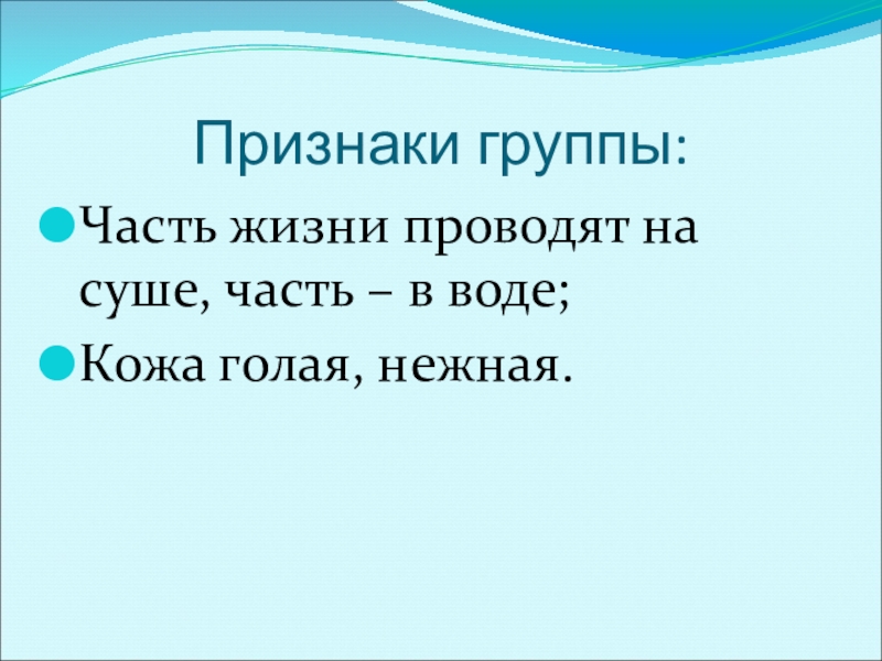 Признаки группы:Часть жизни проводят на суше, часть – в воде;Кожа голая, нежная.