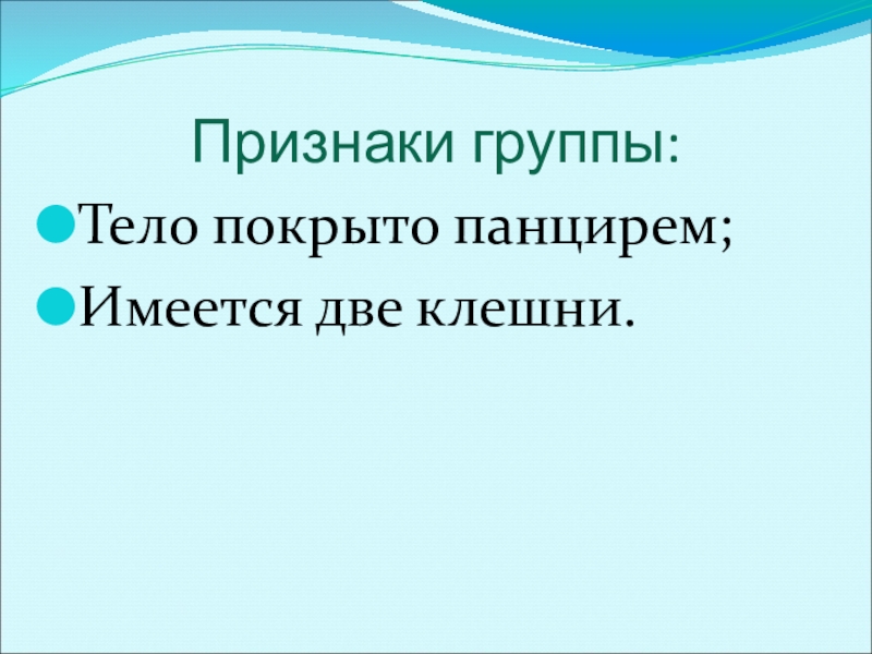 Признаки группы:Тело покрыто панцирем;Имеется две клешни.