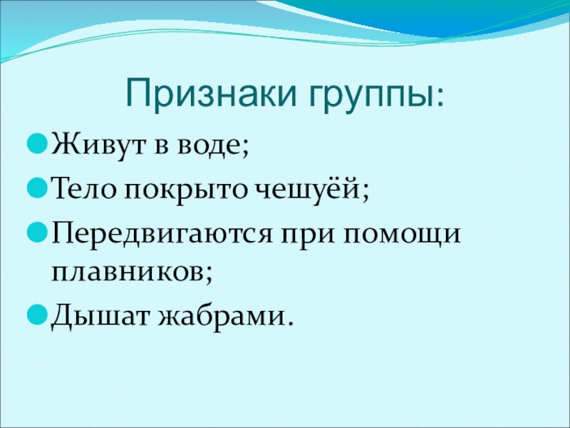 Признаки группы:Живут в воде;Тело покрыто чешуёй;Передвигаются при помощи плавников;Дышат жабрами.