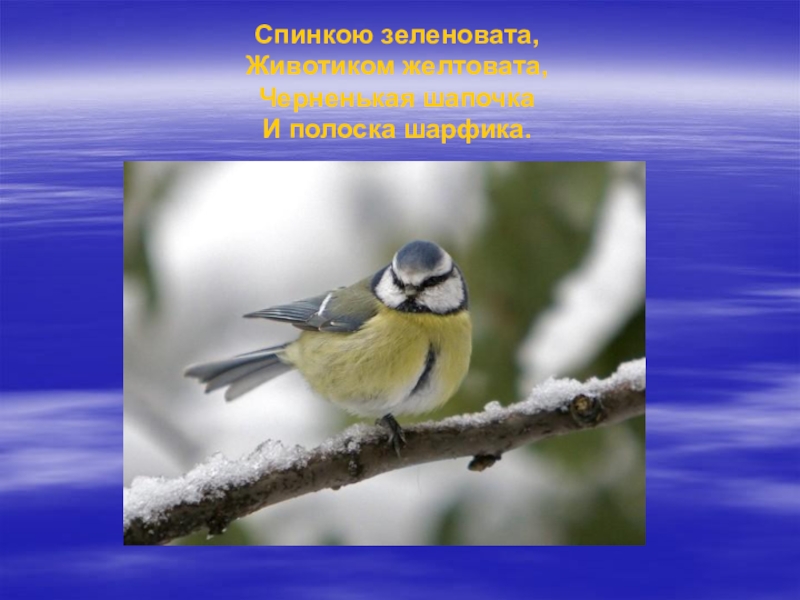 Слайд 8Спинкою зеленовата, Животиком желтовата, Черненькая шапочка И полоска шарфика.