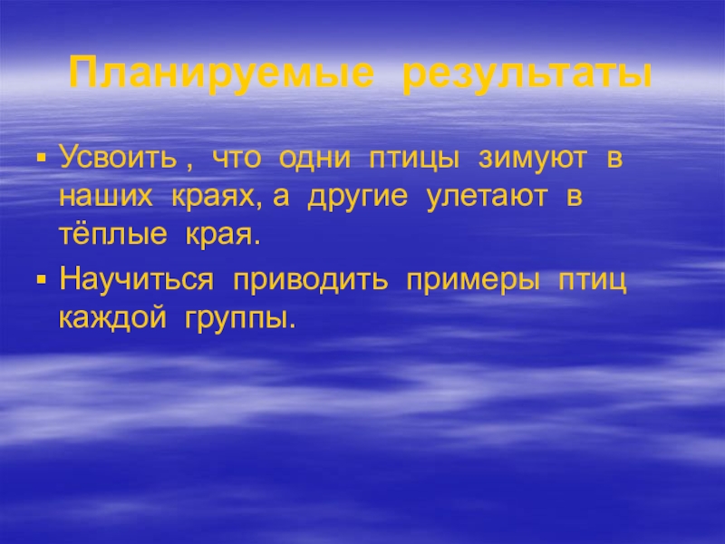 Планируемые результатыУсвоить , что одни птицы зимуют в наших краях, а другие улетают в тёплые края.Научиться приводить