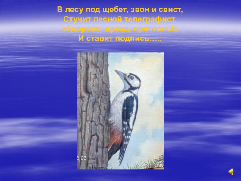 Слайд 5В лесу под щебет, звон и свист, Стучит лесной телеграфист. «Здорово, дрозд, приятель!» И