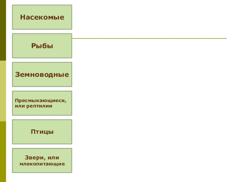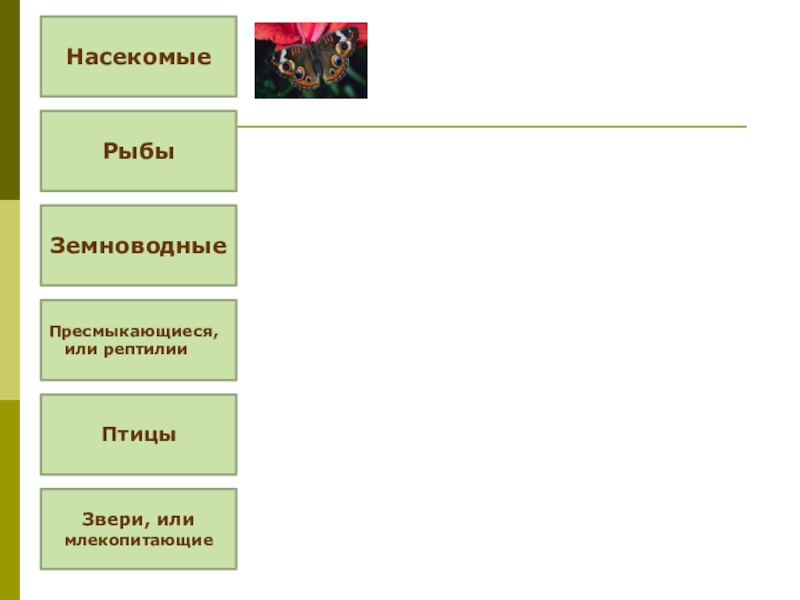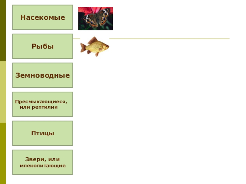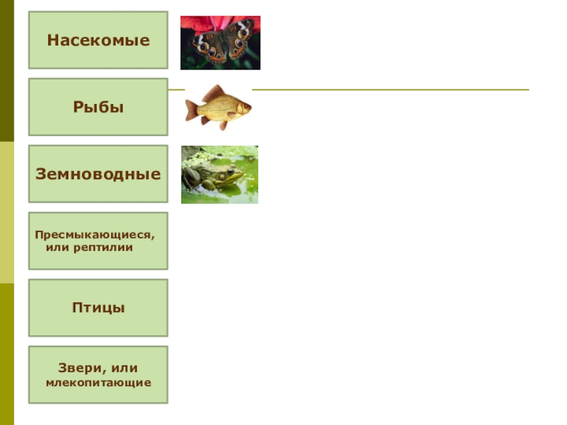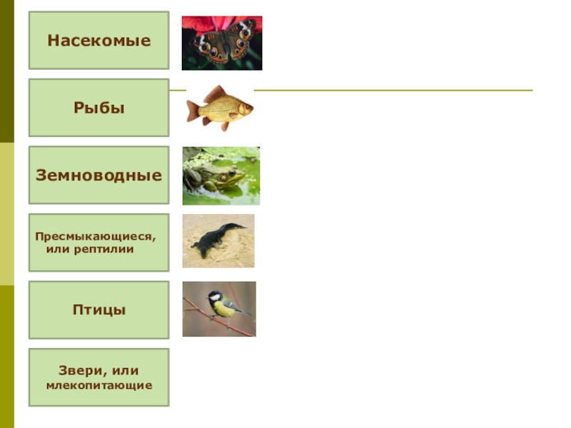 Насекомые Рыбы Земноводные Пресмыкающиеся,  или рептилииПтицы Звери, или млекопитающие