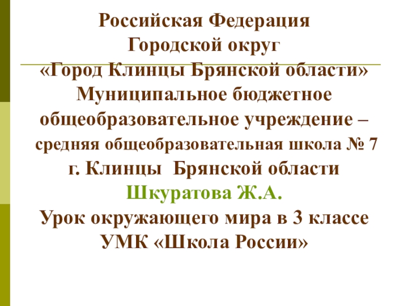 общеобразовательная школа № 7 г. Клинцы Брянской области Шкуратова Ж.А. Урок окружающего мира в 3 классе УМК «Школа России»