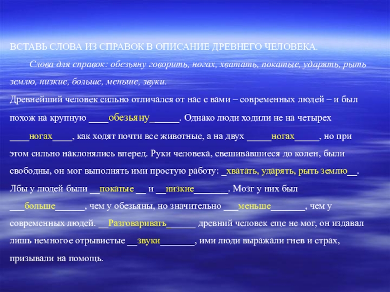 ВСТАВЬ СЛОВА ИЗ СПРАВОК В ОПИСАНИЕ ДРЕВНЕГО ЧЕЛОВЕКА.	Слова для справок: обезьяну говорить, ногах, хватать, покатые, ударять, рыть