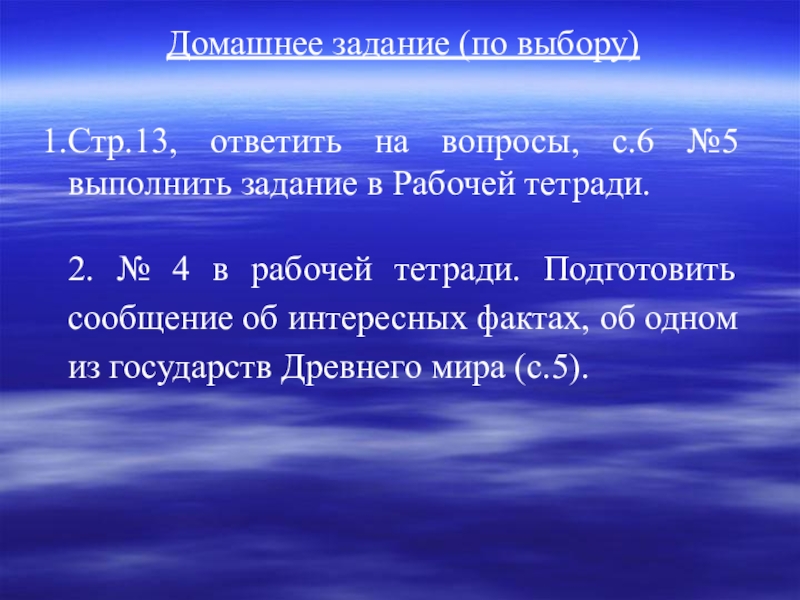Домашнее задание (по выбору)Стр.13, ответить на вопросы, с.6 №5 выполнить задание в Рабочей тетради.2. № 4 в