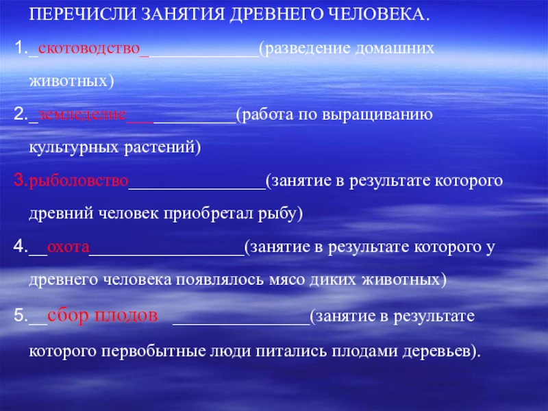 ПЕРЕЧИСЛИ ЗАНЯТИЯ ДРЕВНЕГО ЧЕЛОВЕКА._скотоводство_____________(разведение домашних животных)_земледелие____________(работа по выращиванию культурных растений)рыболовство_______________(занятие в результате которого древний человек приобретал рыбу)__охота_________________(занятие