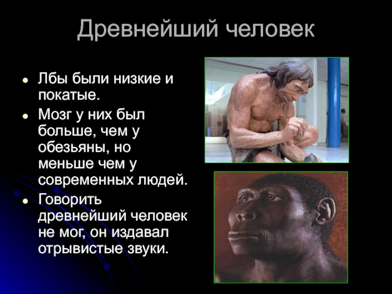 Древнейший человекЛбы были низкие и покатые.Мозг у них был больше, чем у обезьяны, но меньше чем у