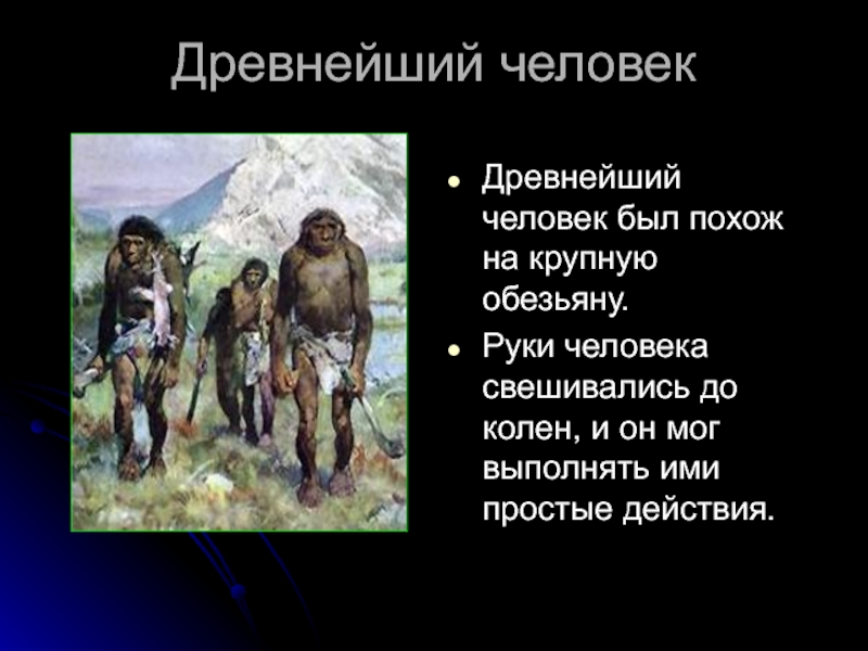 Древнейший человекДревнейший человек был похож на крупную обезьяну.Руки человека свешивались до колен, и он мог выполнять ими