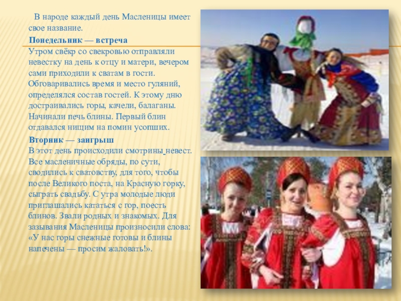 В этот день происходили смотрины невест. Все масленичные обряды, по сути, сводились к сватовству, для того, чтобы после Великого поста, на Красную горку, сыграть свадьбу. С утра молодые люди приглашались кататься с гор, поесть блинов. Звали родных и знакомых. Для зазывания Масленицы произносили слова: «У нас горы снежные готовы и блины напечены — просим жаловать!».