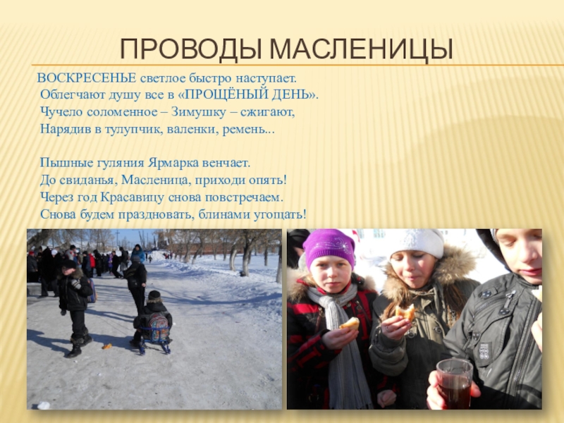 с гуляниями с весёлыми игрищами, песнями и плясками. Пускай живёт и радуется Масленица.